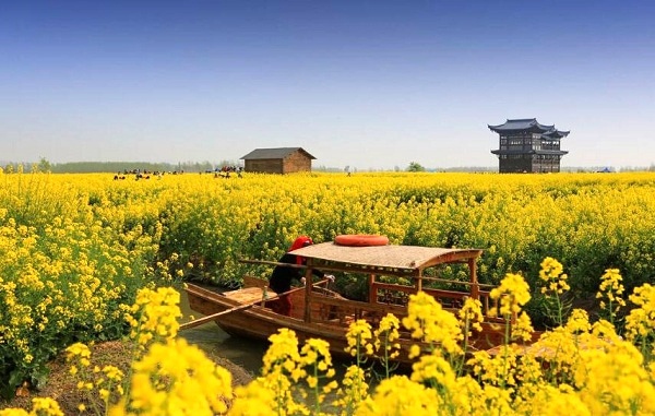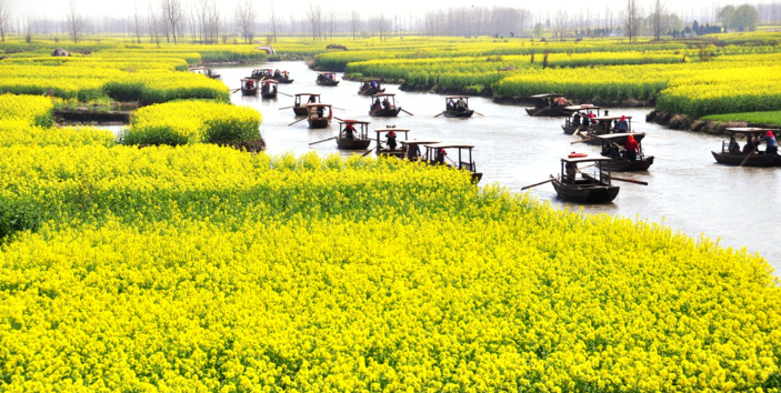 上午,我们一行人穿过城市的喧嚣,来到兴化千垛油菜花风景区。每年春季油菜花开时,千百垛田一同漂浮于水中,“河有万湾多碧水,田无一垛不黄花”金灿灿的油菜花组成了金色的“八卦阵”,传说垛田是当年泰州知州岳飞大战金兵摆下的八卦阵。每年清明前后万亩油菜花开,犹如一朵朵金色的祥云飘舞水面,又似一片片流霞散落人间。大家置身于一望无际的金色花海中,醉人的菜花香沁人肺腑,令人心旷神怡、美不胜收。