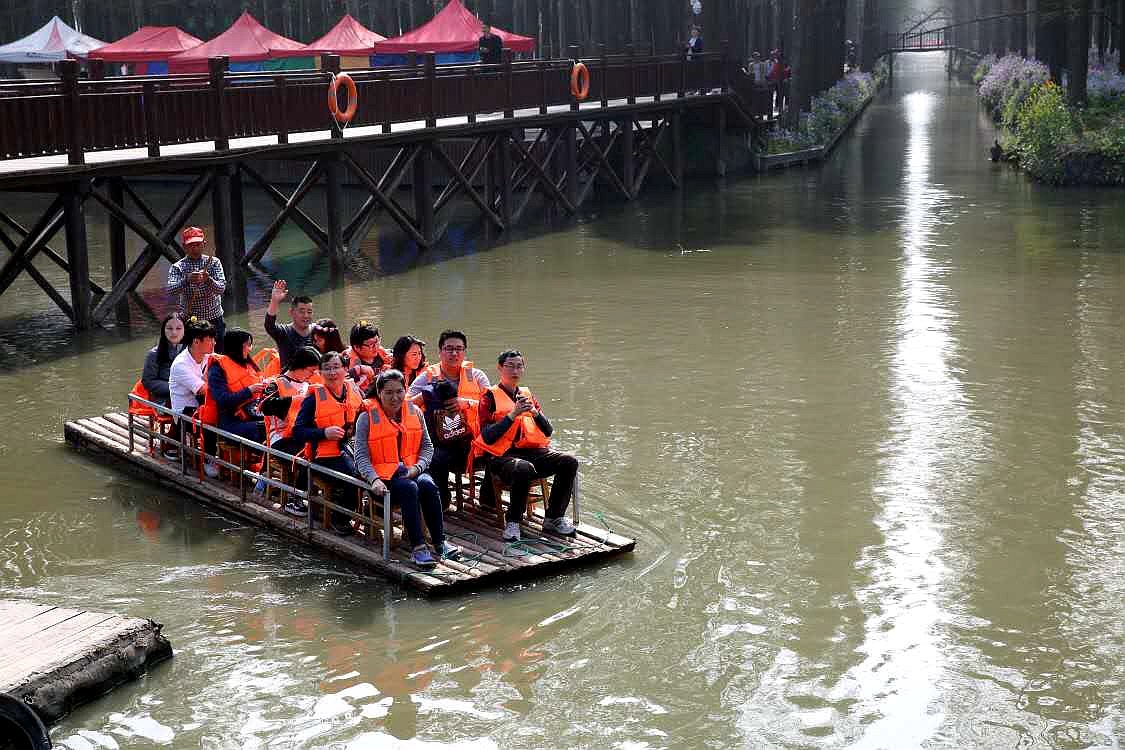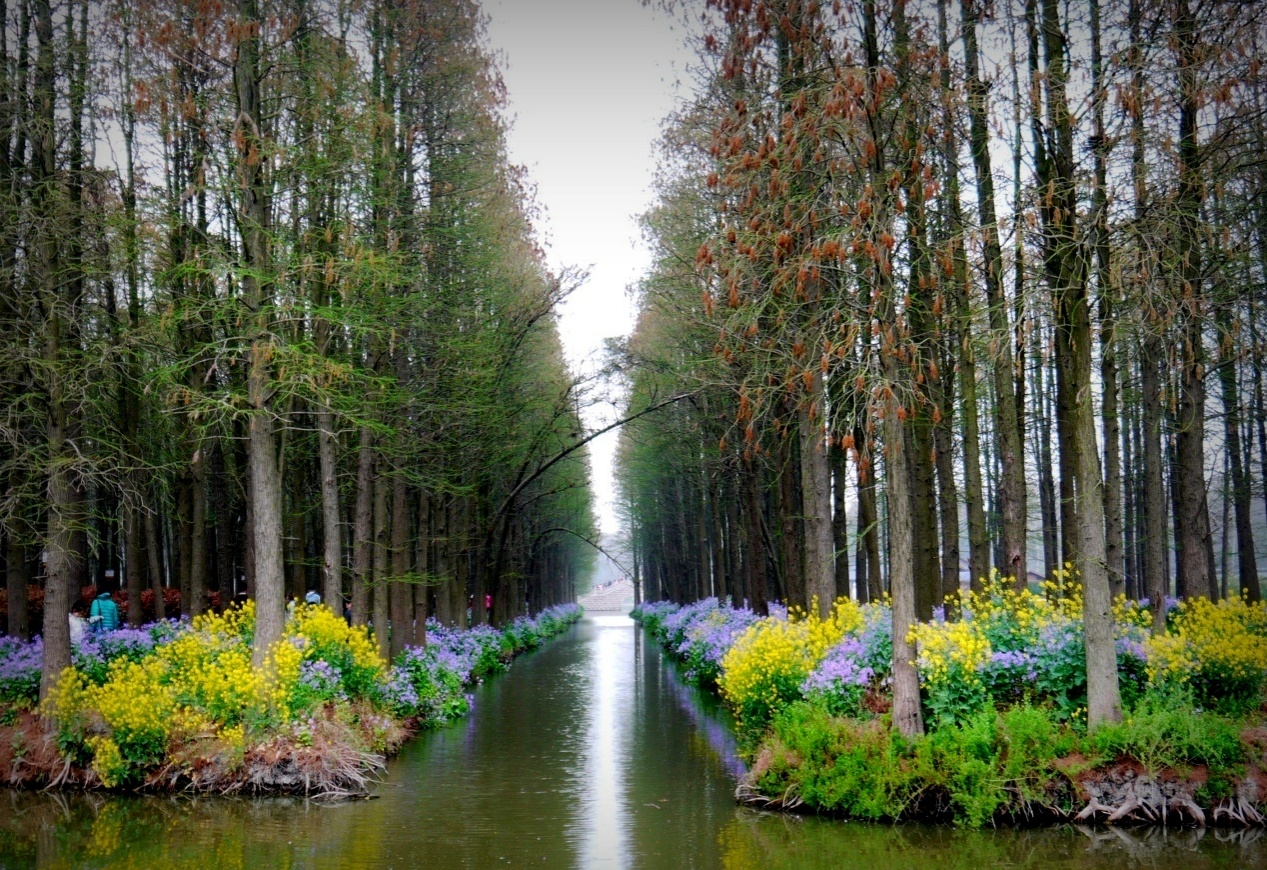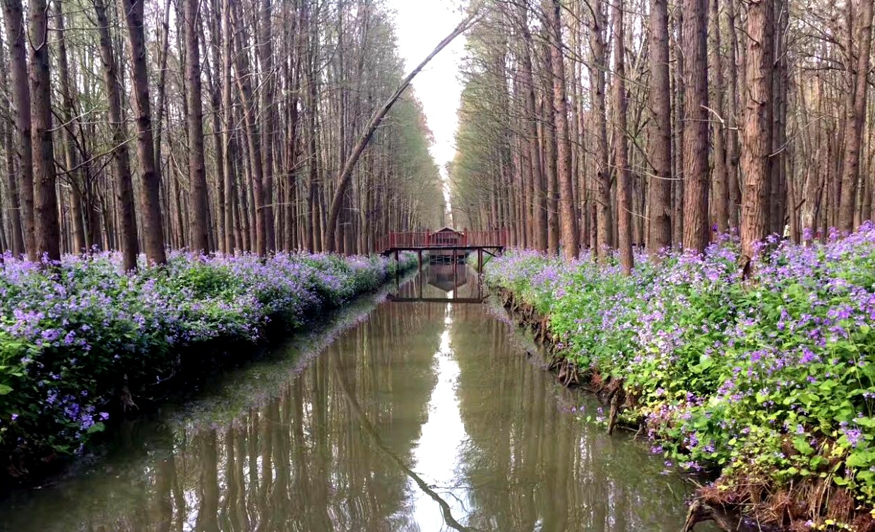 穿过千垛油菜地,我们又来到了兴化水上森林公园。水上森林公园,它采用林垛沟鱼的立体模式。水杉、池杉参天,树梢鸟儿欢聚,沟内鱼儿跳跃,林内郁郁葱葱,形成了"林中有水、水中有鱼、林中有鸟、河流回环、水杉林立"的湿地生态景观。