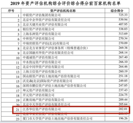 中国资产评估协会近日公布了2019年资产评估机构综合评价结果,江苏华信资产评估有限公司连续多年领跑江苏评估行业。作为江苏省评估行业的领头羊,此次在全国综合评价排名中再获佳绩,继续保持江苏省最佳成绩。