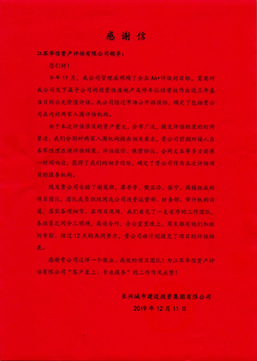 近日,长兴城市建设投资集团有限公司发来感谢信,对市场部吕春琴、评估二部谢英朗带领的团队表达了衷心的感谢,对项目组“客户至上、专业服务”的执业精神以及所提供的优质服务给予了充分的肯定!感谢信全文如下: