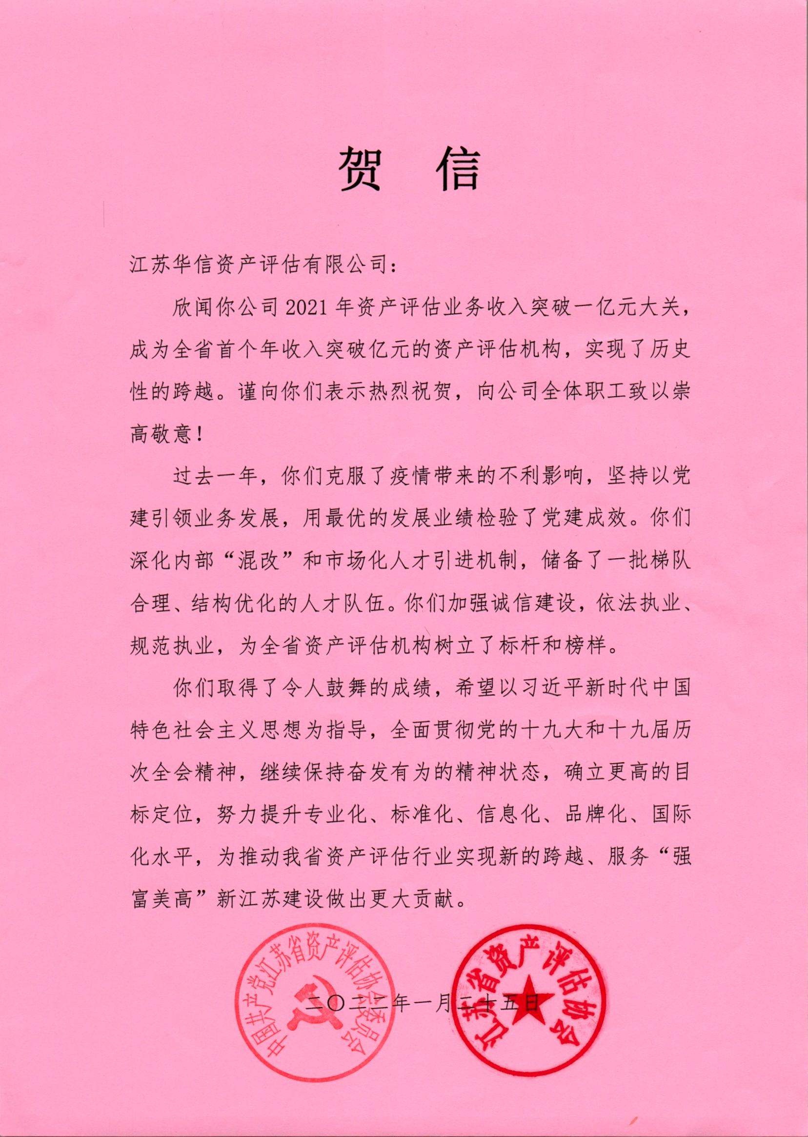 2022年1月25日,江苏省财政厅一级巡视员李载林、江苏省资产评估协会秘书长吴琳等一行莅临江苏华信资产评估有限公司调研、指导工作,并代表省评协党委、省评协祝贺江苏华信成为全省首个年收入突破亿元的资产评估机构。华信评估董事长胡兵、总经理俞家清、首席评估师张建立、副总经理张发文全程陪同,并参与座谈。